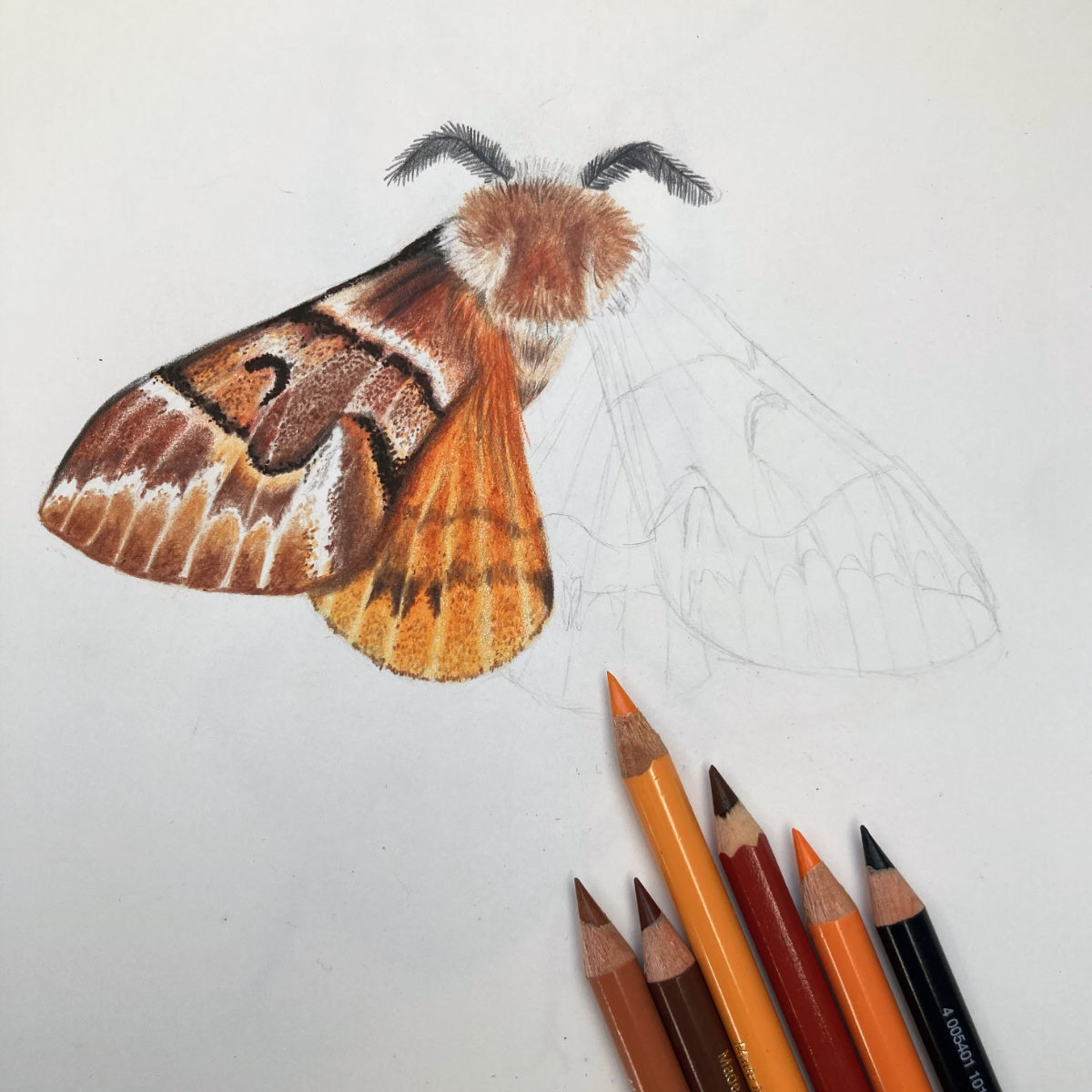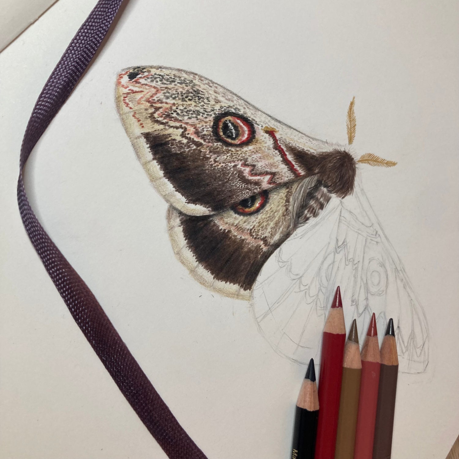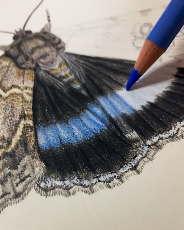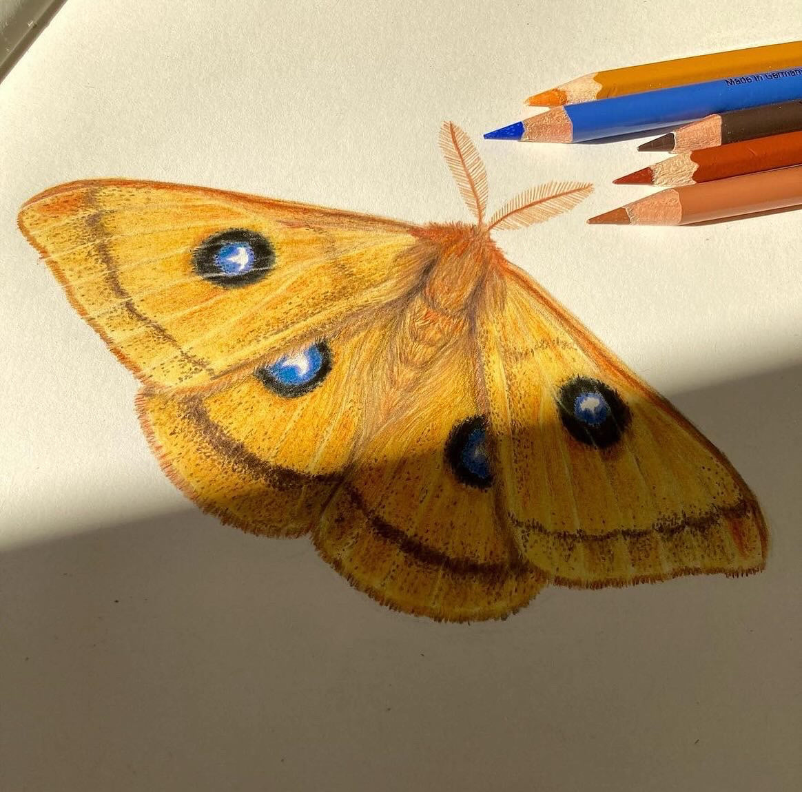 Die Motive zeigen bekannte heimische Falter wie das Abendpfauenauge, das Blaue Ordensband oder den Mittleren Weinschwärmer – alle mit Buntstifte von Hand gezeichnet und mit deutschen sowie lateinischen Namen versehen.