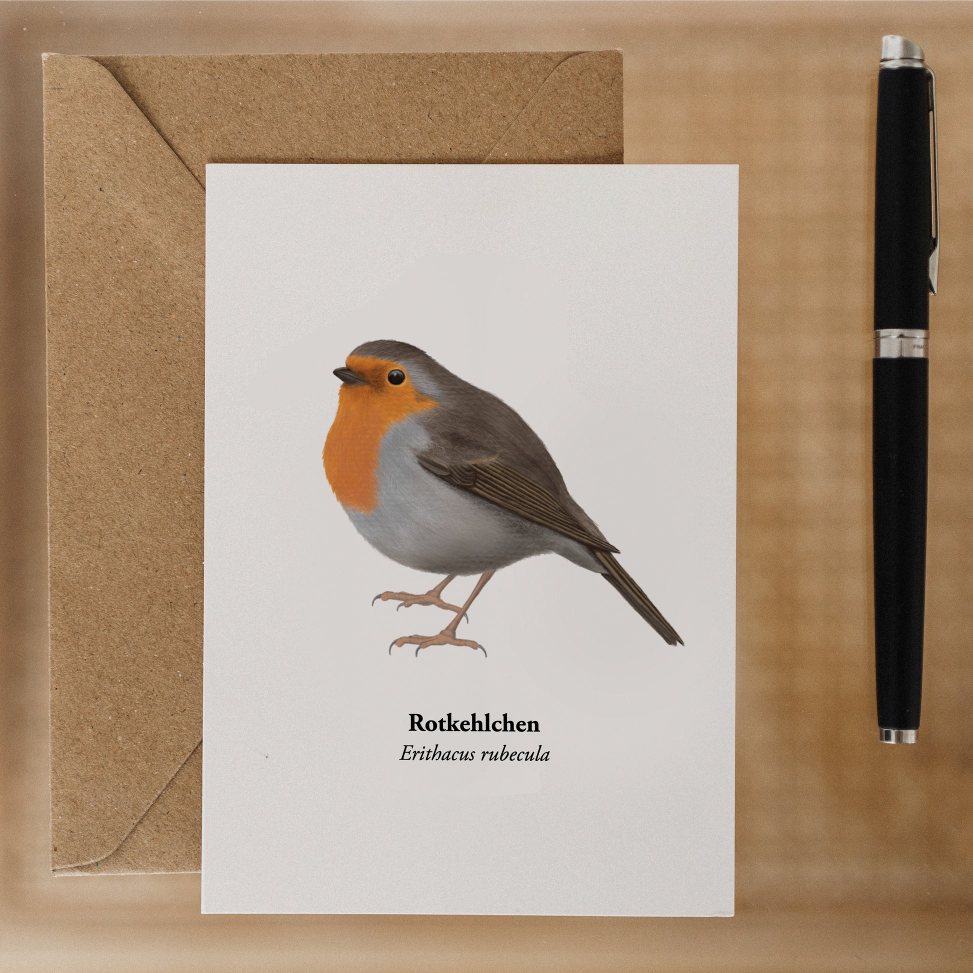 Diese Postkarte zeigt eine detailierte Zeichnung des Rotkehlchens (Erithacus rubecula) – einem der beliebtesten heimischen Gartenvögel. Die warmen Farben, das leuchtende Brustgefieder und die weichen Schattierungen machen die Karte zu einem kleinen Kunstwerk für alle, die Naturmotive lieben.
