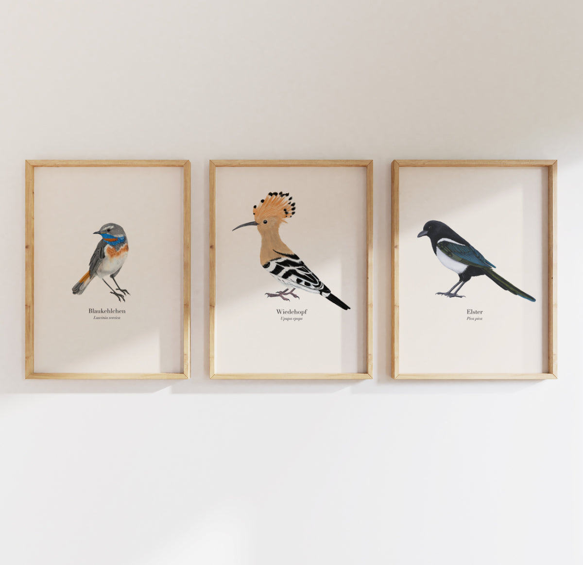 3er Poster Set heimische Vögel – Natur Poster mit Auswahl aus 22 Arten, personalisierbar & optional gerahmt